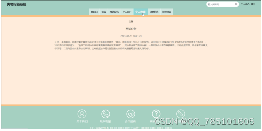 失物招领系统主要功能模块包括首页、网站管理(轮播图、网站公告)、人员管理(管理员、普通用户、发布者)、内容管理(论坛列表、论坛分类列表、)模块管理(寻物信息、物品类别、招领物品、领取申请、寻物咨询)、个人管理(个人信息、修改密码),采取面对对象的开发模式进行软件的开发和硬体的架设,能很好的满足实际使用的需求,完善了对应的软体架设以及程序编码的工作,采取MySQL作为后台数据的主要存储单元,采用springboot框架、JSP技术、Ajax技术进行业务系统的编码及其开发,实现了本系统的全部功能。本次报告,首先分析了研究的背景、作用、意义,为研究工作的合理性打下了基础。针对失物招领系统的各项需求以及技术问题进行分析,证明了系统的必要性和技术可行性,然后对设计系统需要使用的技术软件以及设计思想做了基本的介绍,最后来实现失物招领系统和部署运行使用它。