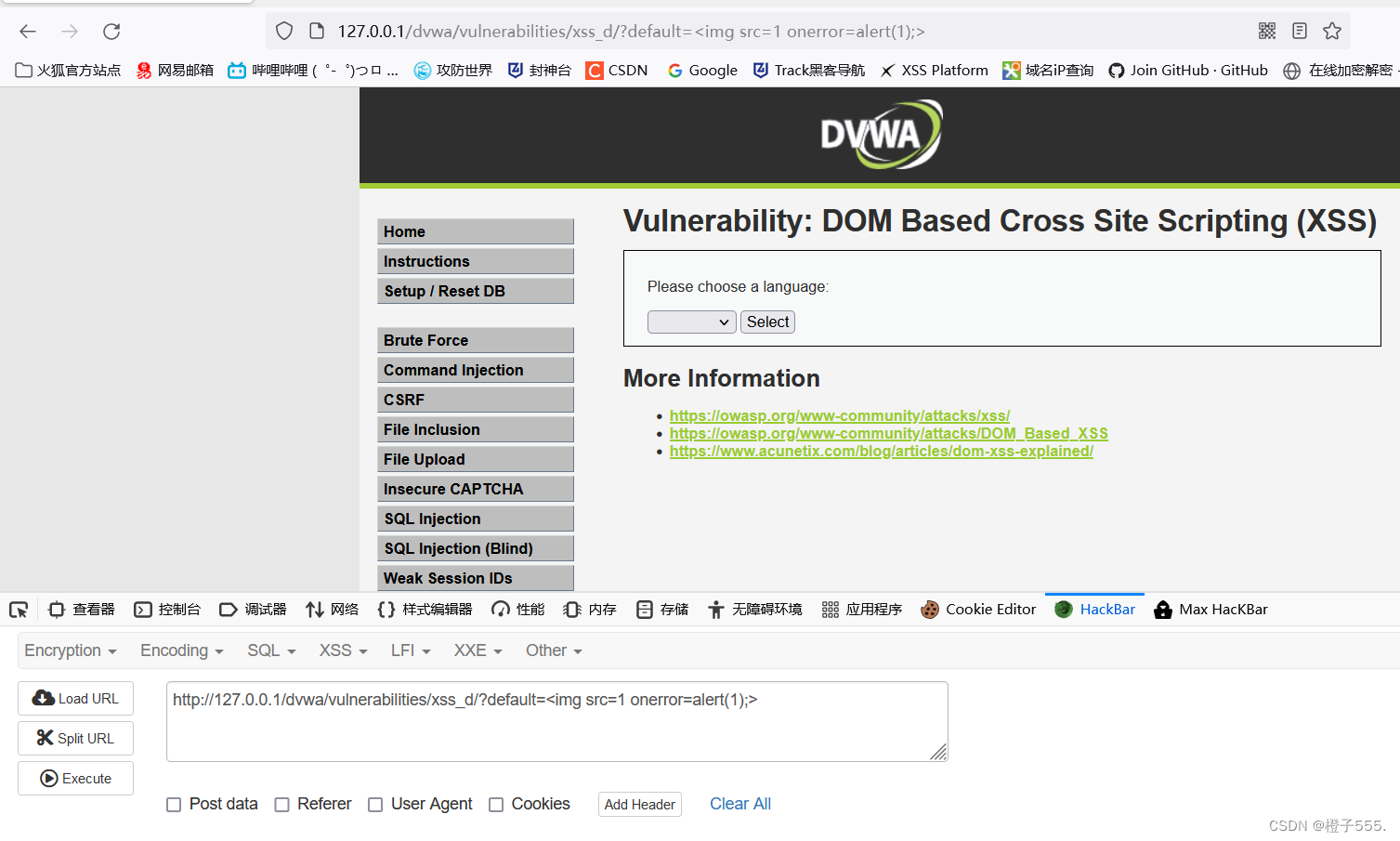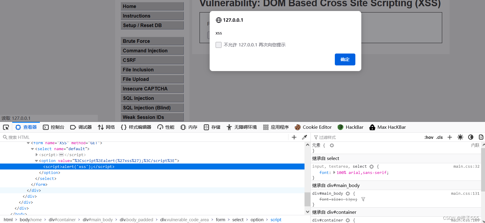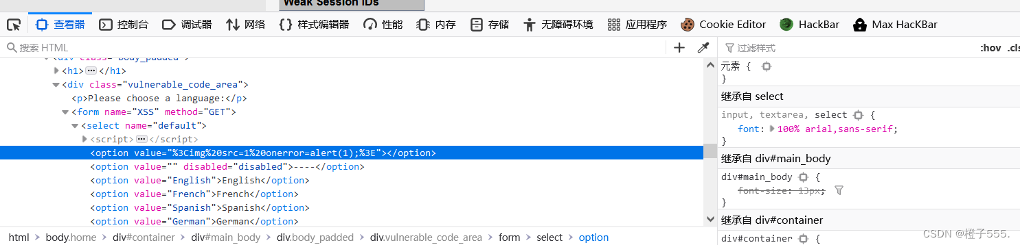 查看页面代码,发现我们构造的语句已经被插入到了value当中,不能成功执行的原因是select标签中只允许内嵌option标签,而option标签是不能嵌套我们构造的img标签的,因此我们需要先将前面的select标签和option标签都闭合后才能使用img标签.