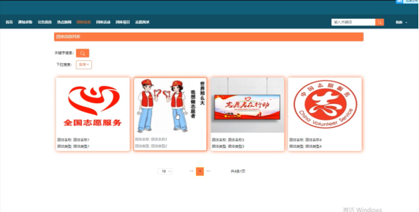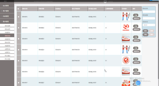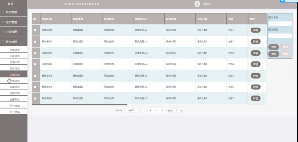 浏览团体活动:用户可以根据团体活动类型浏览团体活动的信息,并选中某个团体活动查看详情,例如:团体名称、团体类型、活动地点、人数限制数量、报名开始时间、宣传图片、活动状态、活动内容、团体负责人等。