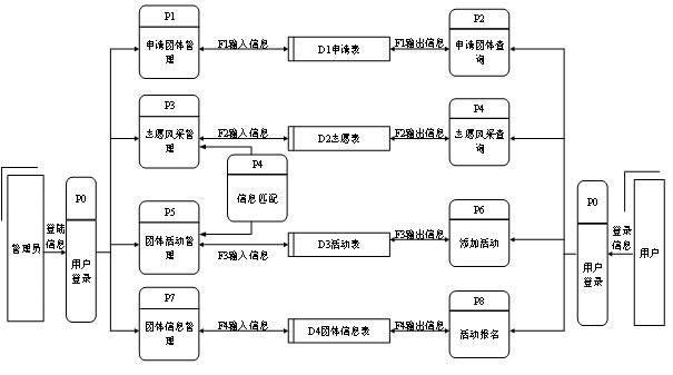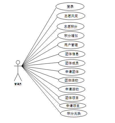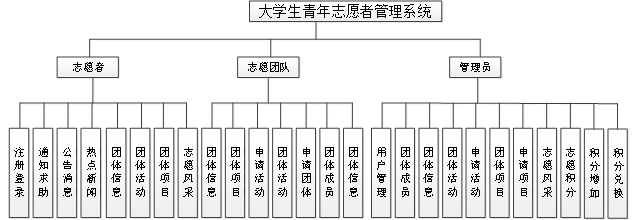 大学生青年志愿者管理系统的功能主要分为前台用户根据自己的需求进行注册登录,浏览志愿活动信息并对选中的志愿活动进行报名操作。后台系统管理员因职责的不同,分为普通管理员和超级管理员,管理员主要对用户管理、团体信息、团体成员、申请团体、团体活动、申请活动、团体项目、申请项目、积分兑换、志愿积分、积分增加、志愿风采进行处理。