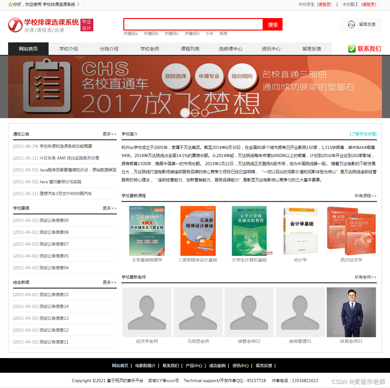 | 方案设计 | 用户注册:填写手机账号和密码,注册新用户 登录功能:注册普通账号登录;登录后可以修改用户的基本信息,也可以退出。 关于我们:学校简介、关于我们、联系我们、加入我们、法律声明、学校详情 轮播广告:后台设置首页轮播广告图,可以连接到广告页面。 留言反馈:用户填写李哭咽的主题、联系人、电话、邮箱、留言内容;后台管理可以查看留言列表,可以删除留言。 校园风光列表:显示所有校园风光,可以点击左侧校园风光分类筛选 校园风光信息:游客和用户都可以进行查看校园风光信息。 校园风光收藏:查看到有兴趣的校园风光,注册登录的用户可以进行收藏操作。 校园风光评论:查看到有兴趣的校园风光,登录的用户,可以发表评论;后台审核后显示 分院介绍:列出学校所有分院、可以点击查看详情查看 分院选修课:按分院列出安排的课程表 选修课报名:选修课课程表,自动判断是否和当前学员必修课是否冲突 老师中心:列出学校所有老师,尅点击查看详情了解老师信息 学校课程:列出学校所开设所有课程,点击课程详情可以查看课程 班级信息:列出学校开设的所有班级信息,可以点击查看班级信息了解班级信息 班级排课:每个班级信息右侧,可以点击最终课程表,查看排课信息 资讯列表:显示所有资讯,可以点击左侧资讯分类筛选 资讯阅读:游客和用户都可以进行资讯的阅读。 资讯收藏:阅读到有兴趣的资讯,注册登录的用户可以进行收藏操作。 资讯评论:阅读资讯的时候,登录的用户,可以发表评论;后台审核后显示。 我的班级信息:新生报到的班级信息,里面有相关联系方式,地址等 我的必修课-课程表:新生报到所在班级的课程表,根据课程表上课 我的选修课-课表:自己选修的课程的课程表 学籍和宿舍信息:老师录入和安排的学籍和宿舍信息,个人信息可以在用户信息修改 用户信息:姓名、联系方式、邮箱、头像、简介、介绍等,支持随时修改;用户注册的信息后台管理员可见;后台管理员可以删除。 密码修改:修改注册的密码。 退出登录:清除登录的cookie,返回到首页。 | |||||||