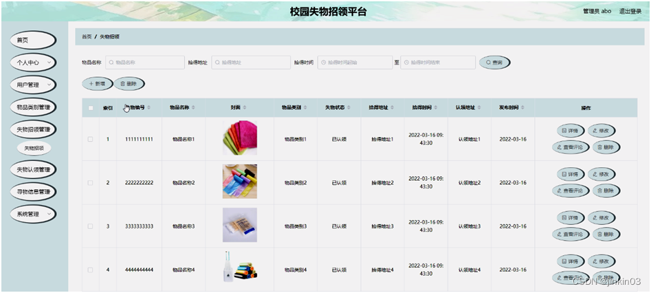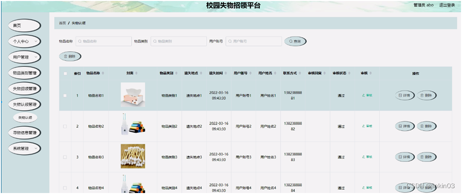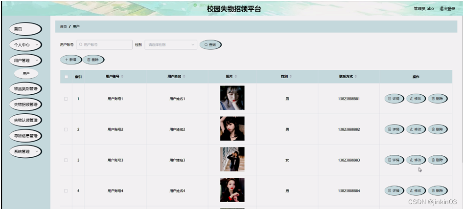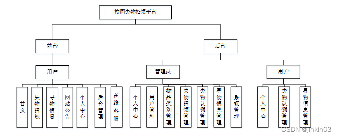 通过市场调研及咨询研究,了解了校园失物招领平台及管理者的使用需求,于是制定了管理员和用户等模块。功能结构图如下所示: