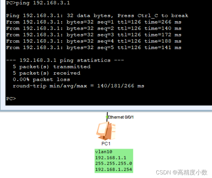 验证:配置完后,PC1可以ping通网关192.168.1.254