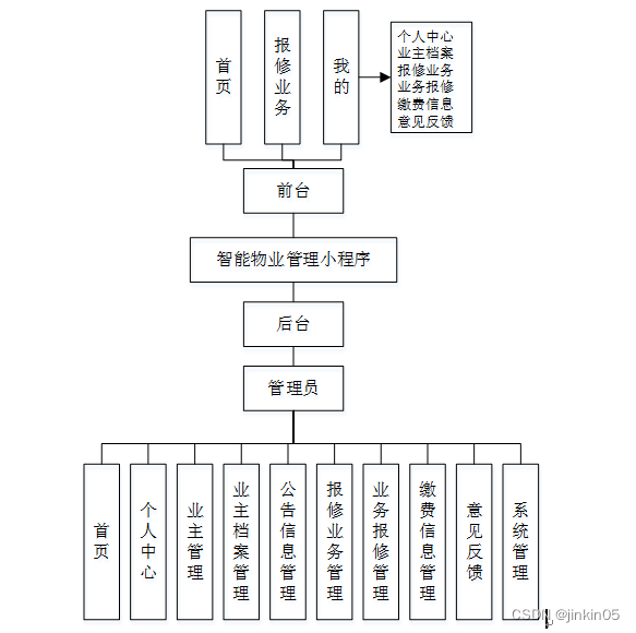 智能物业管理小程序分两大部分,即管理员管理和用户管理。系统按照用户的实际需求开发而来,贴近生活。从管理员出拿到分配好的账号密码可以进入小程序,使用相关的系统应用,管理员总体负责整体系统的运行维护,统筹协调。