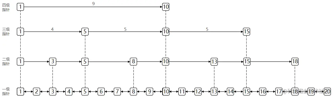- 不同层指针到下一个节点的跨度不同,层级越高,跨度越大