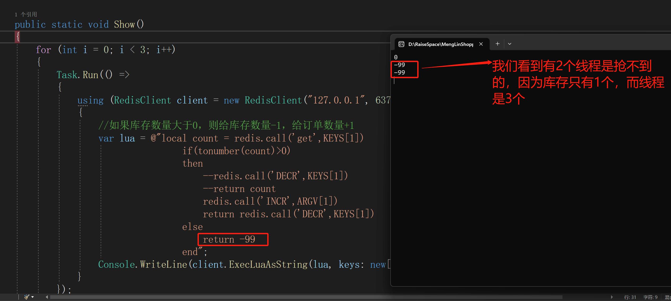 Console.WriteLine(client.ExecLuaAsString(lua, keys: new[] { "inventoryNum" }, args: new[] { "orderNum" }));