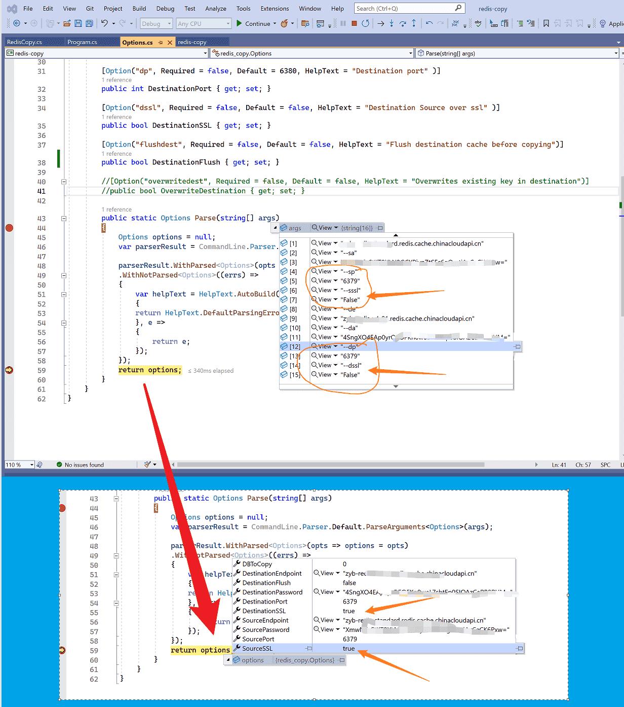 [主要]方案一:在Options.cs 文件中,修改SourceSSL 和DestinationSSL 的默认值为False。当需要使用6380端口连接时,携带 --sssl , --dssl参数