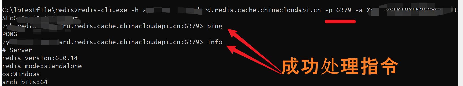 redis-cli.exe -h yourcachename.redis.cache.chinacloudapi.cn -p 6379 -a YourAccessKey