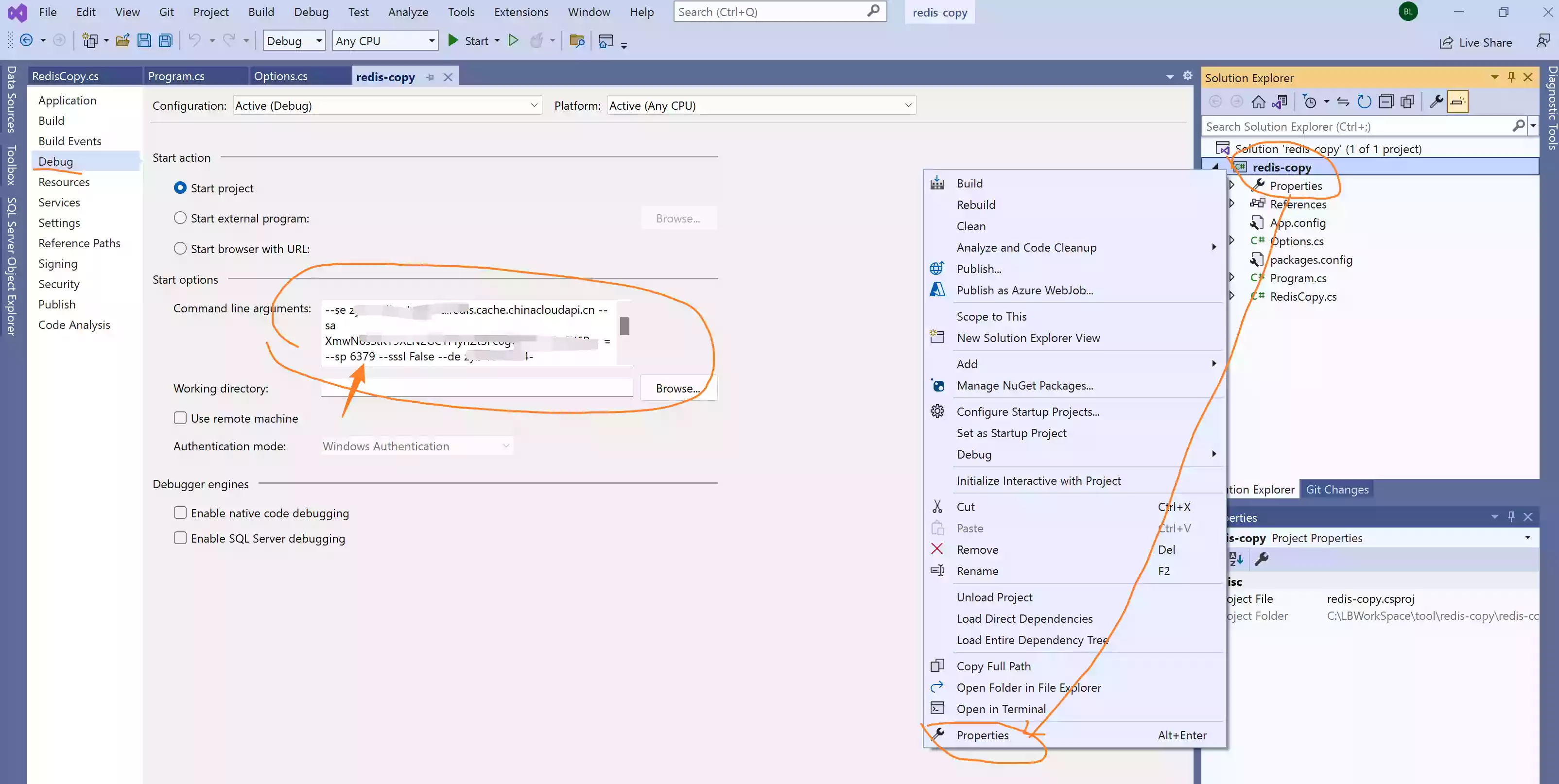 第二步:本地Visual Studio 工具打开后,把启动指令后面携带的参数填入Debug Start options中