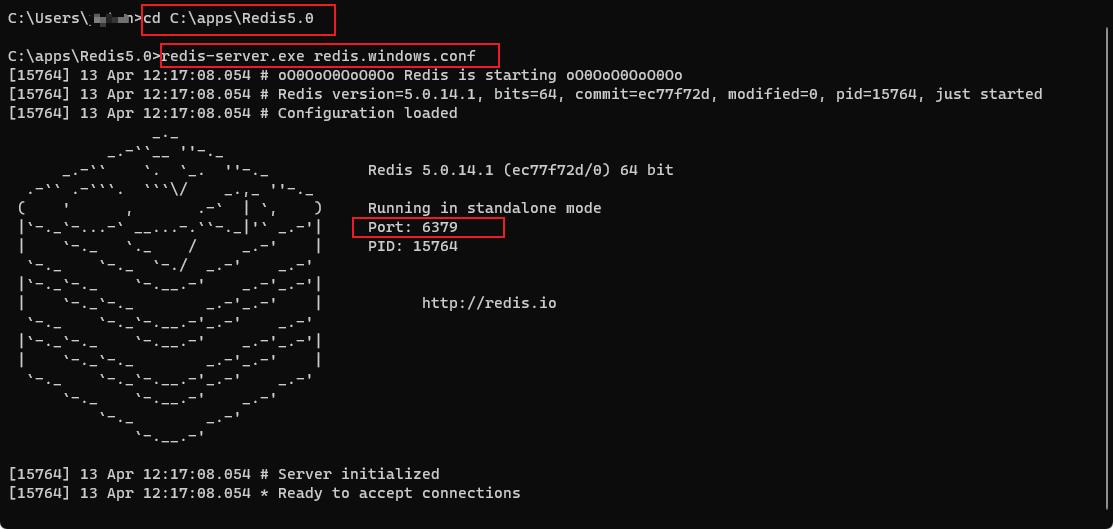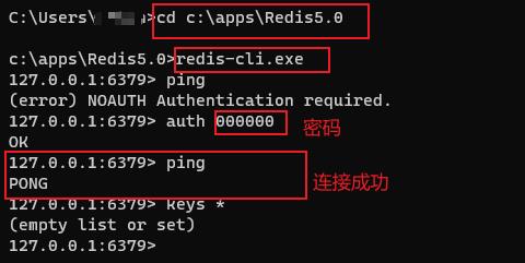 需要注意的是密码太简单后续springboot连接时会报错:io.lettuce.core.RedisCommandExecutionException: ERR invalid password,我开始设置的是000000,修改成其他密码就不报错了 - 启动redis,进入windows命令行,cd到安装路径,然后如下图: