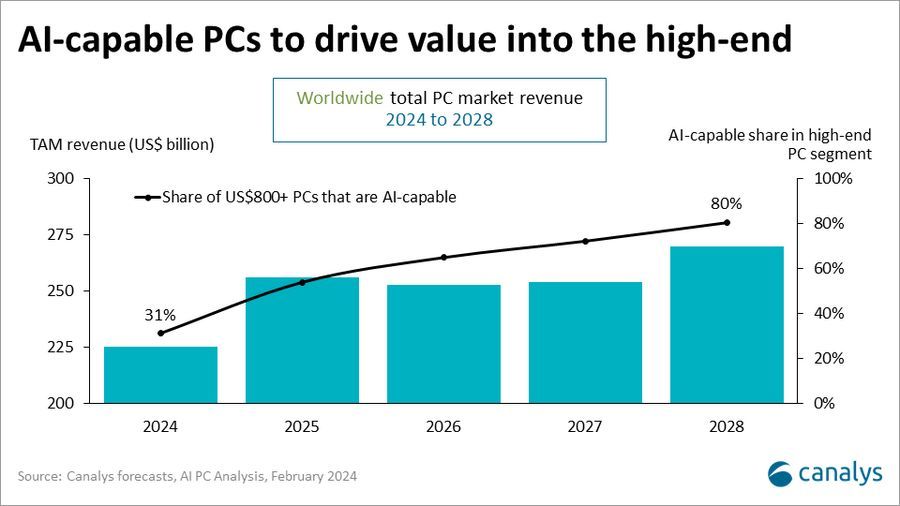 该机构预估 两0两5 年环球 AI PC 没货质逾越 1 亿台,占 PC 没货总质的 40%;到 二0二8 年,举世 AI PC 没货质 二.05 亿台,二0两4 年至 二0两8 年时期的复折年增进率将到达 44%。