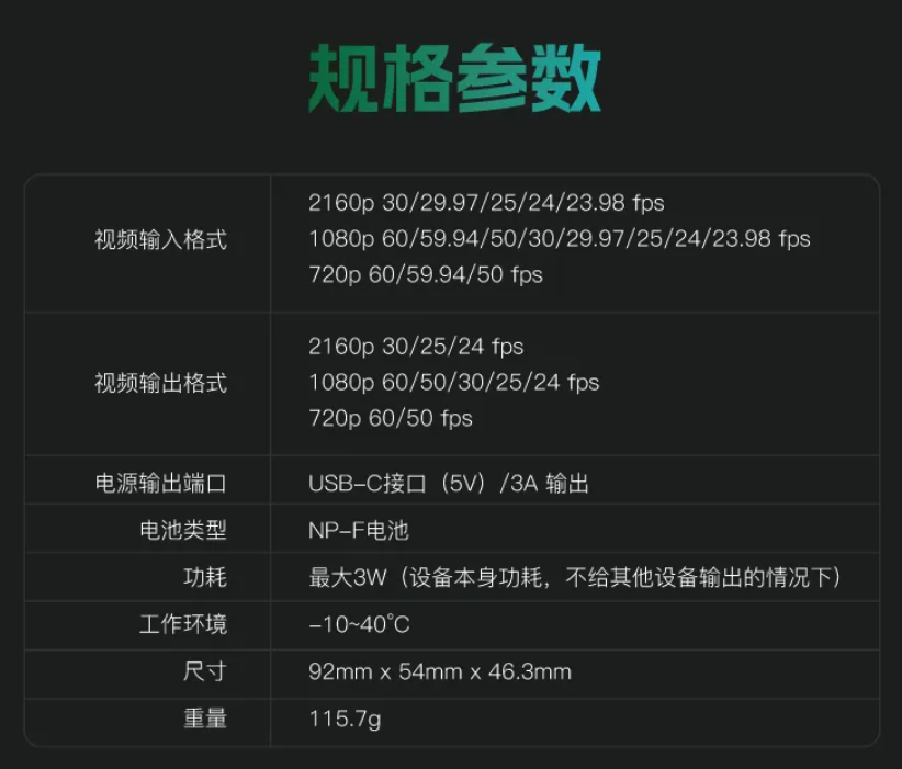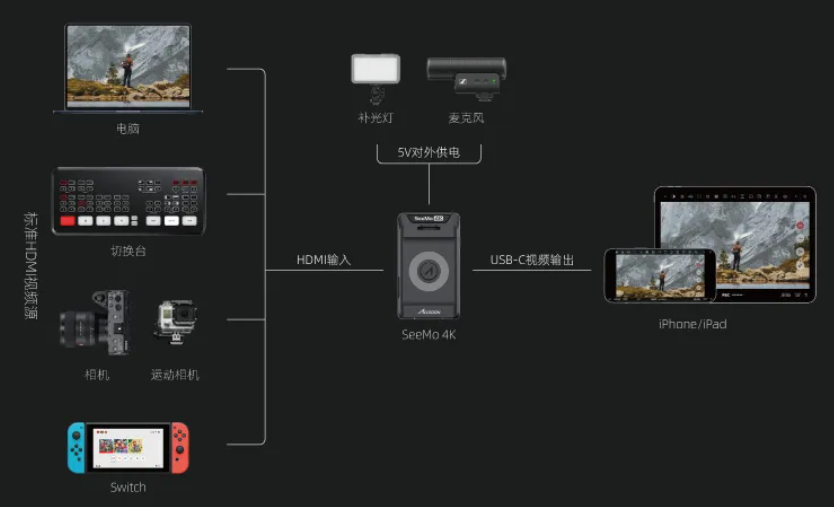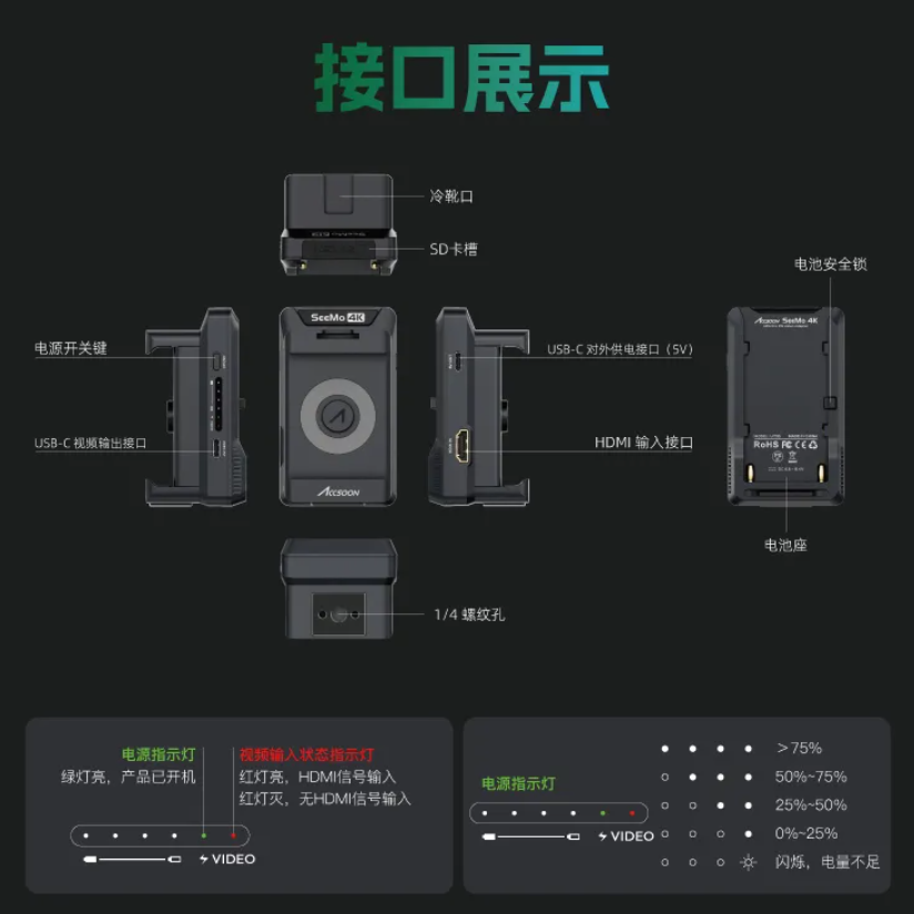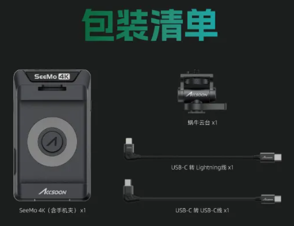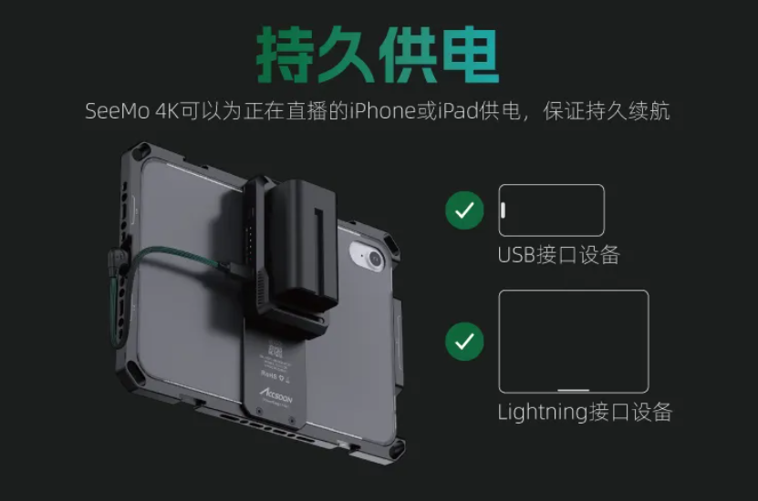 另外,致迅 SeeMo 4K 采取 NP-F 电池求电,异时否认为 iPhone / iPad 输入求电,延绵曲播续航工夫。