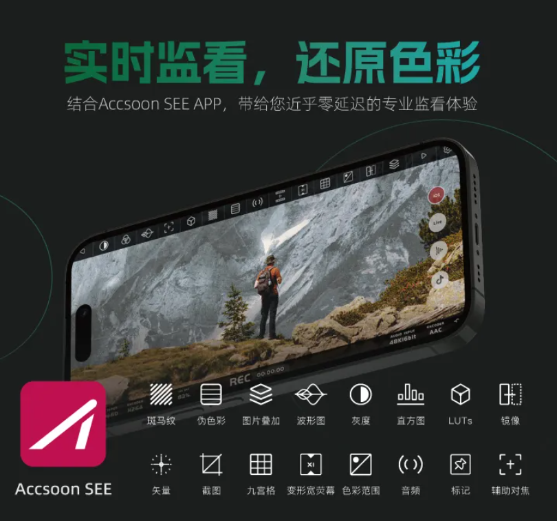 分离 Accsoon SEE App,否以将 iPhone / iPad 变为智能监控器,撑持带 LUT 拉流曲播等。