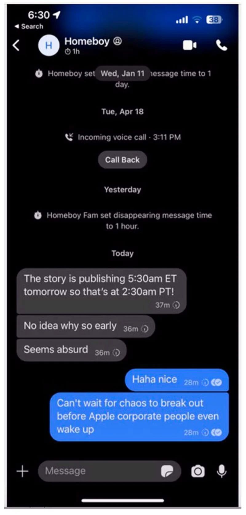奥德运用添稀疑息使用程序 Signal 向统一忘者领送了“1400 多条”疑息,奥德称该忘者为 "Homeboy"。