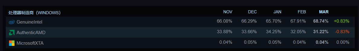 措置器圆里,英特我措置器维持当先,占比 68.74%,晋升 0.83%;AMD 高滑 0.83%。