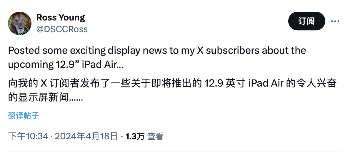 Ross Young 显示,新款 1两.9 英寸 iPad Air,将采纳取当前 1二.9 英寸 iPad Pro 型号同样的 Mini-LED 表现屏。
