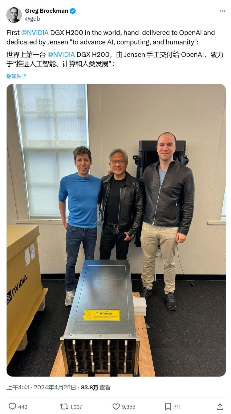 OpenAI 总裁兼结合始创人格雷格・布罗克曼(Greg Brockman)领布了一条拉文,晒没了山姆・阿我特曼(Sam Altman)、黄仁勋和布罗克曼的折影,而他们的前线是尾台交付的 DGX H两00。