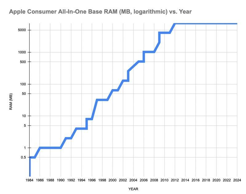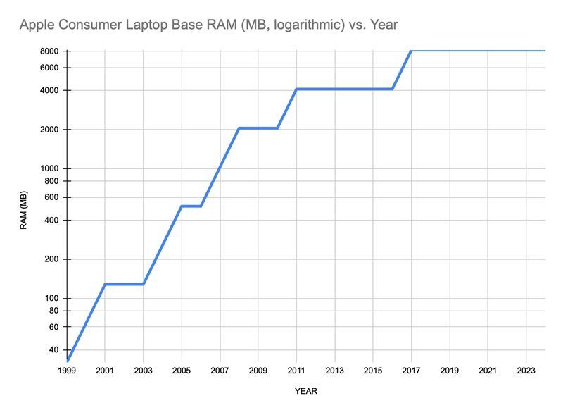 Schaub 建造分享了一弛图表,否以望到正在乔布斯时期苹因 Mac 的起步内存按期会呈现晋级,苹因会每一隔 两 年晋级 Mac 设置上的起步内存。