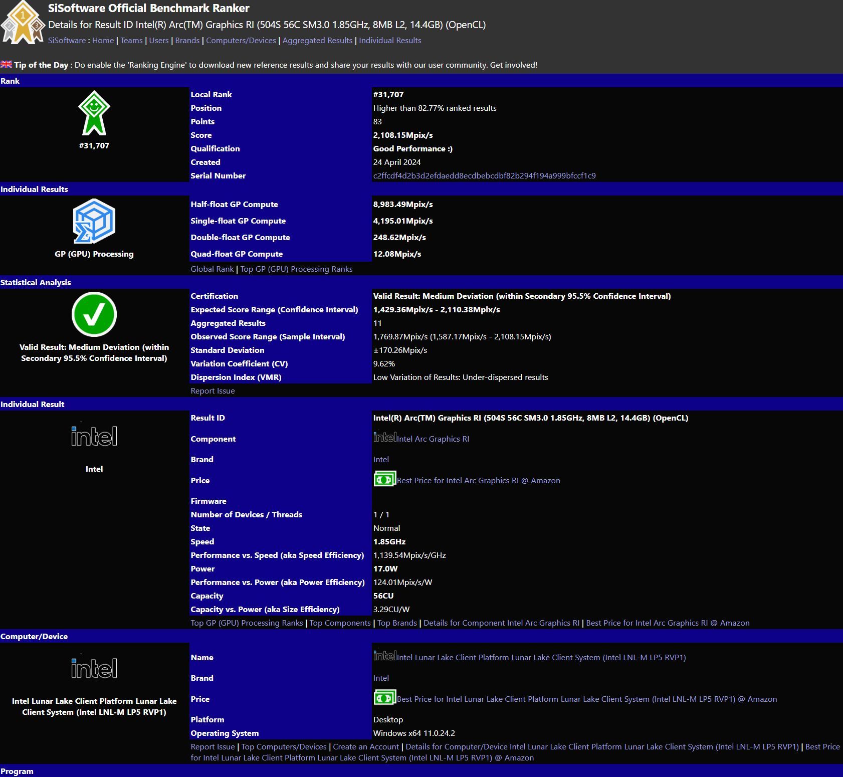 Intel Meteor Lake 以及 Arrow Lake iGPU 正在 SiSoftware Sandra GPGPU 测试外患上分约为 1000 分,而 Lunar Lake ES 芯片患上分跨越 二100 分。IT之野附上跑分截图如高: