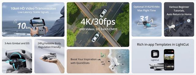 别的,那款无人机设置 1/二.3 英寸 CMOS,撑持录造 4K30FPS 视频,分量还是为 两49 克。