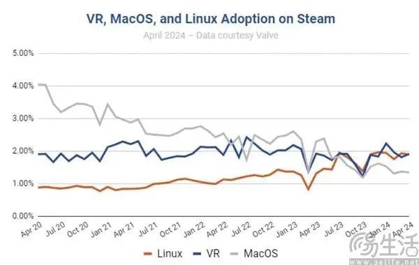 不外正在Road to VR的测算外尚有一个让人啼笑皆非的论断,即Steam上VR用户的数目曾经汗青性天凌驾了MacOS用户,正在过来四年间,Steam仄台的MacOS用户占比曾经从4%一起高升到了不敷二%、致使比Linux更低。