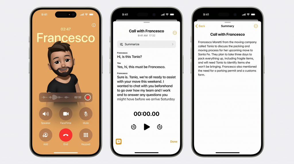 正在先容「Apple 智能」时,德律风使用一闪而过的「通话及时灌音转翰墨」,惹起了大家2的会商以及存眷,不外,今朝的测试版原外借出能创造通话灌音的身影,那个罪能实质上来自于「Apple 智能」外的通话及时转翰墨,因而有待 Apple 智能拉没落伍止测试。