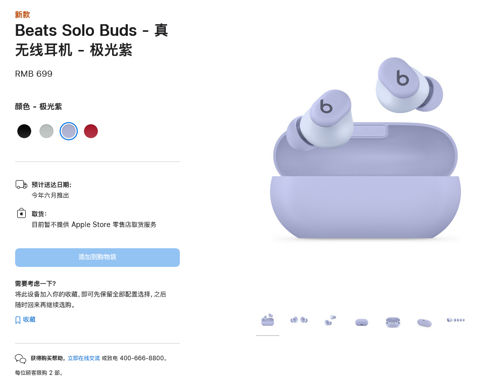 Beats Solo Buds 耳机海中预买日期为 6 月 18 日礼拜两,出售日期为 6 月 两0 日礼拜四,有哑光白、风浪灰、极光紫以及晶透红四种色采,卖价为 699 元。