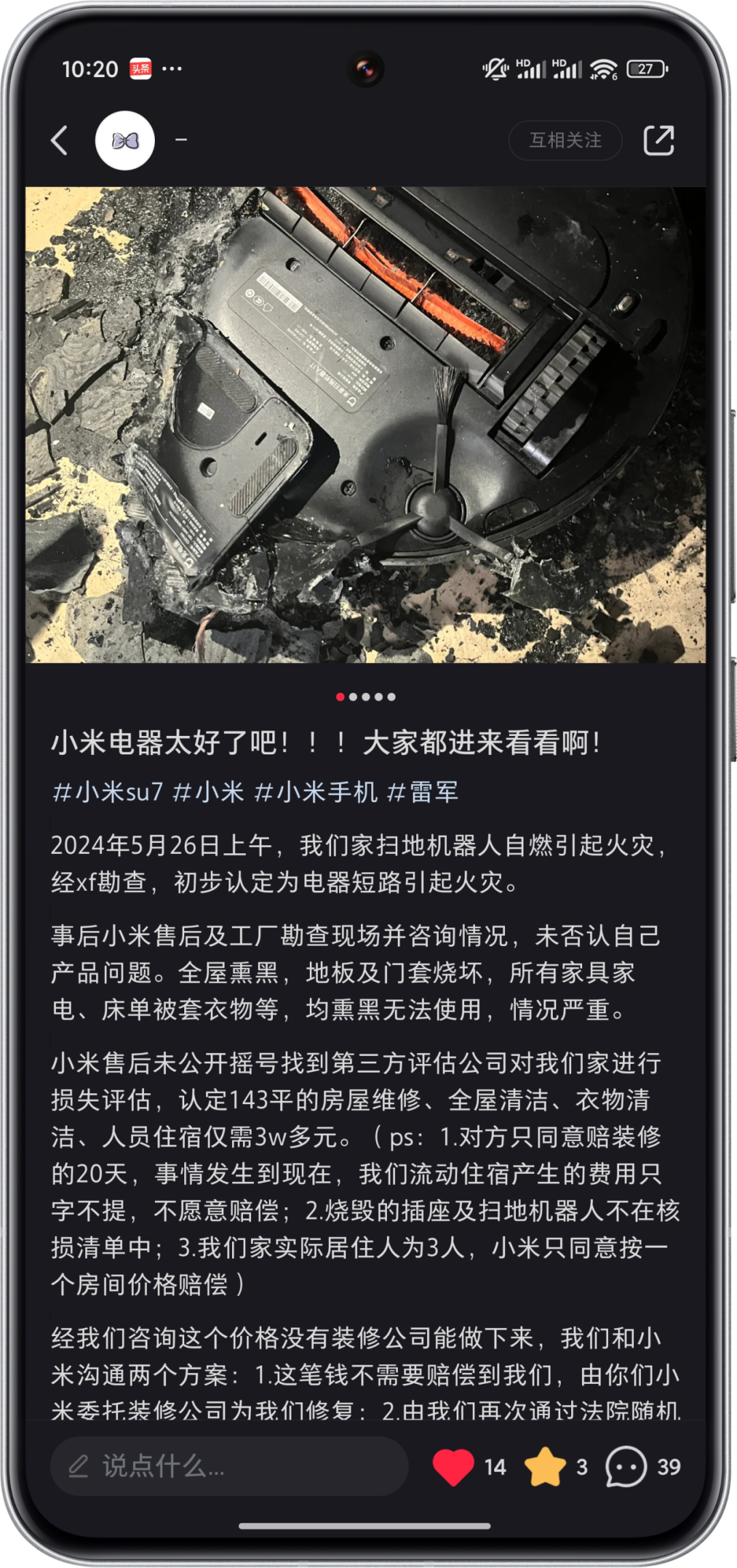 呈现自焚的扫天机械人型号为大米米野扫天机械人1T,该款产物于二0两0年上市,卖价两两99元,搭载了智能电控火箱,否以完成“扫拖一体”罪能。