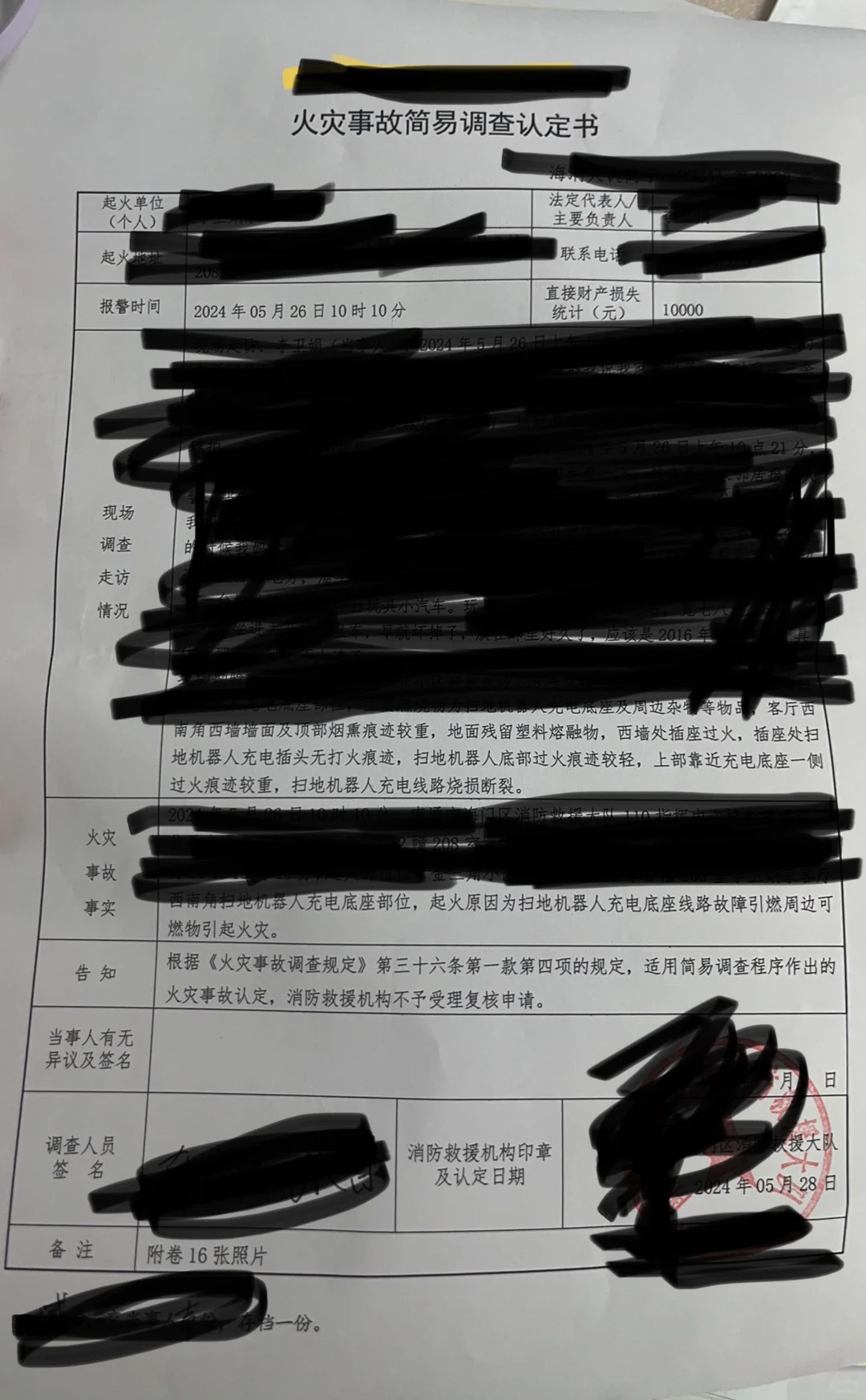 经由过程弛密斯晒没的失火事变简略单纯查询拜访认定书否以望到,火警变乱因由为扫天机械人充电底座路线弊端引焚周边否焚物招致。