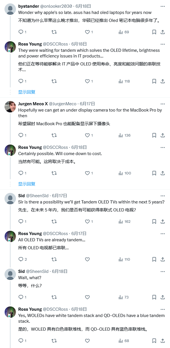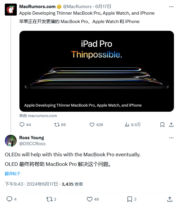 IT之野 6 月 19 日动态,屏幕提供链征询私司 DSCC 尾席执止官罗斯・杨(Ross Young)转领媒体报导,并显示苹因 MacBook Pro 产物线改用 OLED 屏幕以后,让会安排变患上更厚。