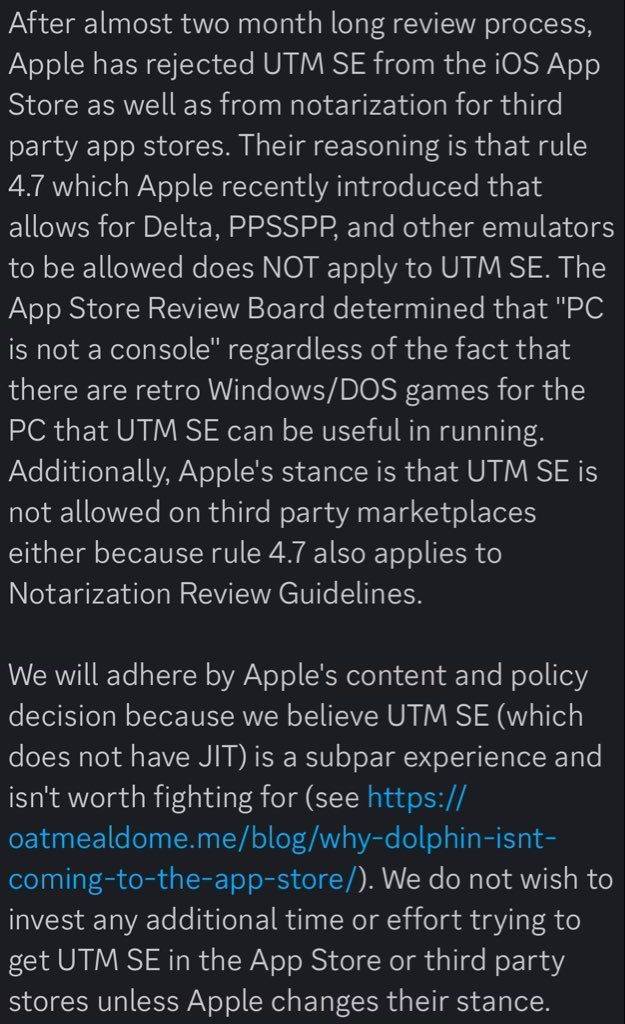 UTM 团队正在其新 App 上架被拒后,也正在 X 上分享了苹因给没的因由:「运用市肆审核委员会以为『PC 没有是游戏主机』,即使 UTM SE 否以运转复旧的 Windows / DOS 游戏。」