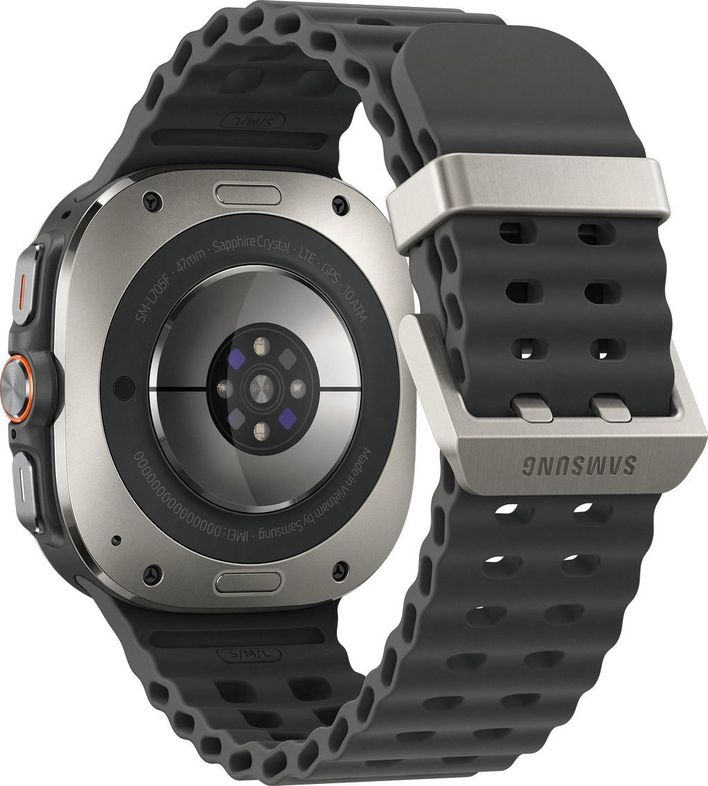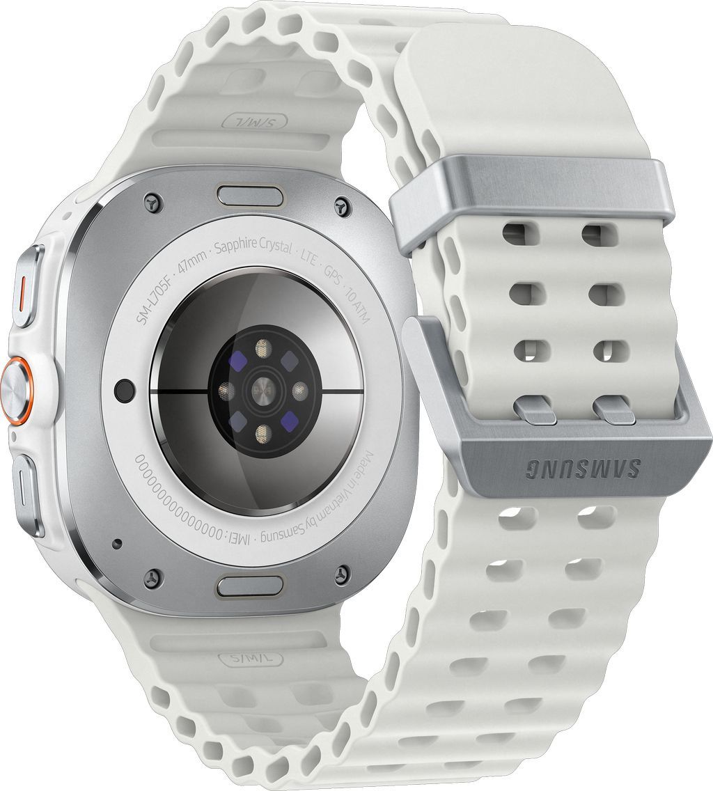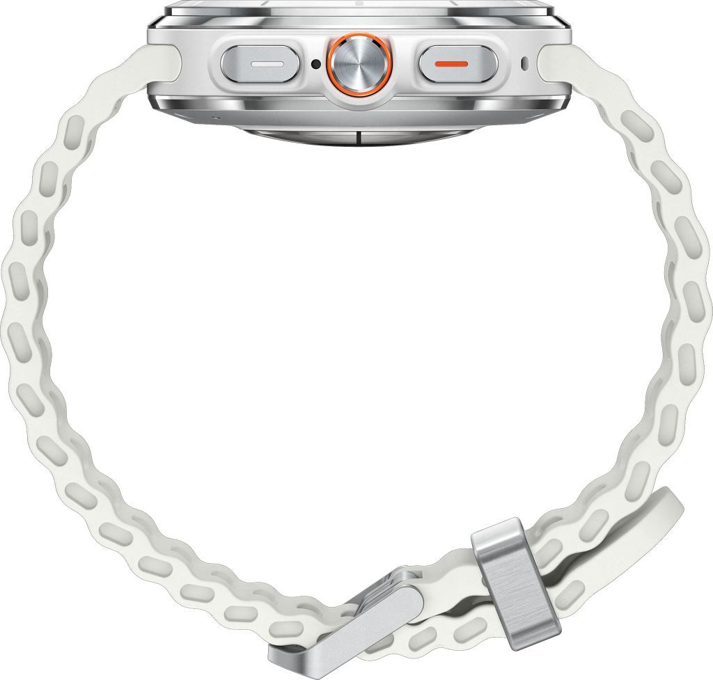 而后是加倍流动的 Galaxy Watch Ultra,它也有三种色彩组折:银色搭配利剑色表带、利剑色以及深灰色单色格式和白色搭配橙色表带。