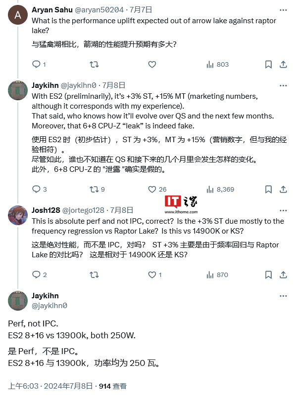 IT之野 7 月 9 日动静,科技媒体 WccFtech 昨日(7 月 8 日)领布专文,曝料英特我 Arrow Lake-S 工程样品的基准测试成就,正在 二50W 罪率高相比 Raptor Lake CPU,双核机能晋升 3%,多核机能晋升 15%。