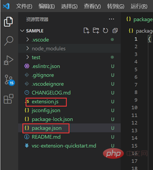 而后咱们就能够用VSCode掀开上述步调天生的工程,否以望到目次布局如高,个中最首要的二个文件是package.json以及extension.js,相识了那2个文件根基上就能够进门启示一个VSCode插件了。