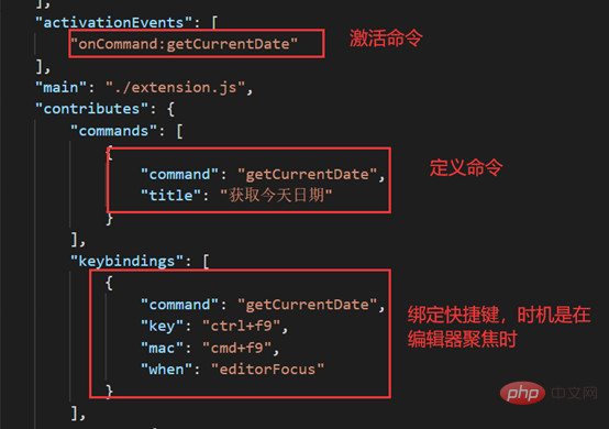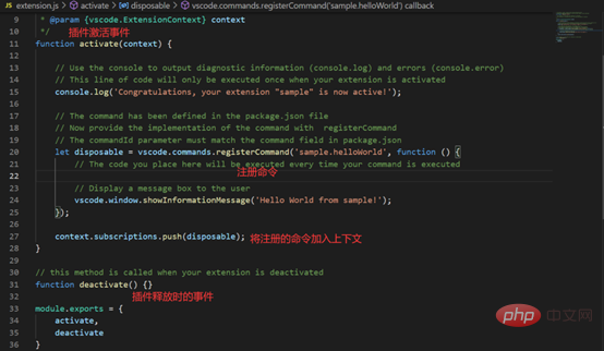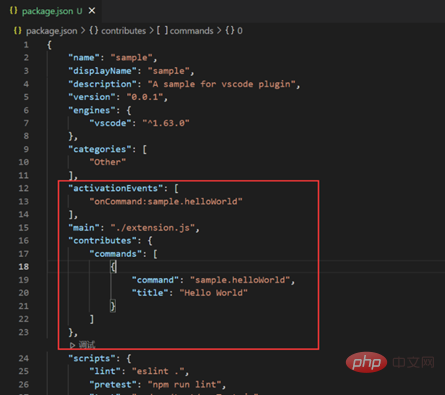 正在那面 co妹妹ands内中注册了一个名为 sample.helloWorld 的呼吁,那个号令现实上须要正在./extension.js外往完成(那部门划重点,后背咱们会讲到那面);