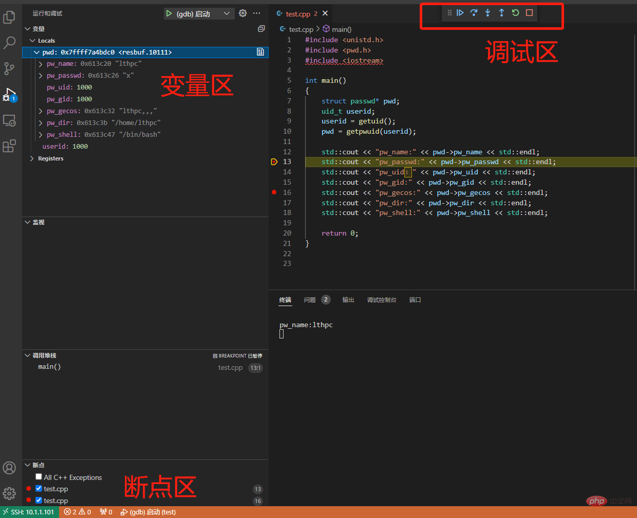 std::cout pw_name pw_passwd pw_uid pw_gid pw_gecos pw_dir pw_shell <p>编译办法如高,注重必然要加之 -g 指令,不然无奈 gdb 调试</p>